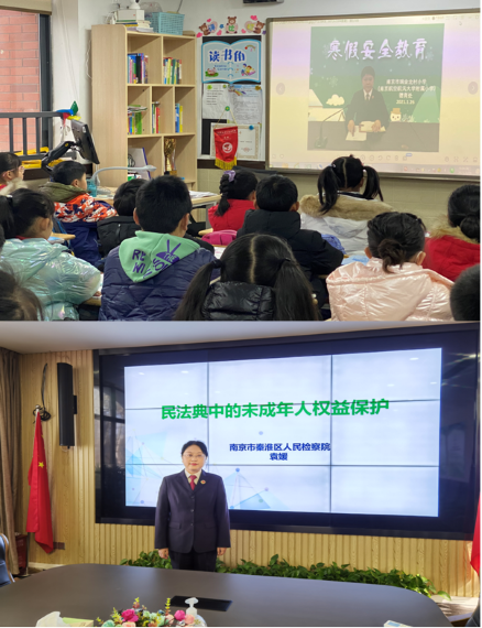 在南京市第一中学初中部,民行部门检察官还专门讲授了今年1月1日起正式施行的民法典,从民法典是一部百科全书,涵盖了社会生活的方方面面、民法典是一部护身宝典,明确了未成年人的权利义务、民法典是一部共同约定,凝聚起保护未成年人的共同责任三个方面,重点和同学们探讨了未成年人权益的法律保护问题。检察官根据受众学生年龄特点,针对小学生侧重自护知识的讲解,并贯穿更多的游戏互动环节,针对中学生则安全自护和犯罪预防并重,并加以适当的法条解读,让不同认知水平的学生享受到假期前“定制法治套餐”,勉励同学们好好学习,遵纪守法,增强自我保护意识,树立法治思维。